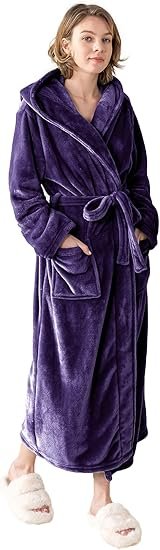 Hooded Plush Fleece Women Bathrobe Full Length Spa Robe