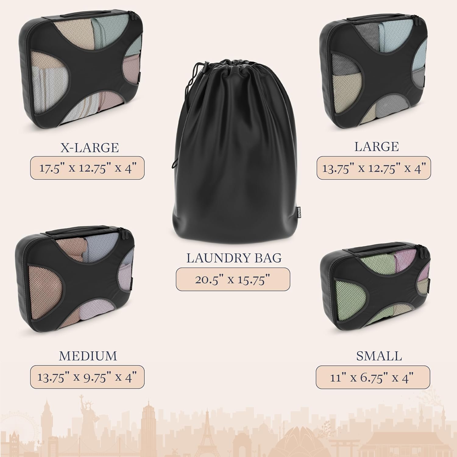 • Complete Travel Kit: Includes five cubes plus a laundry bag for up to 14-day trips