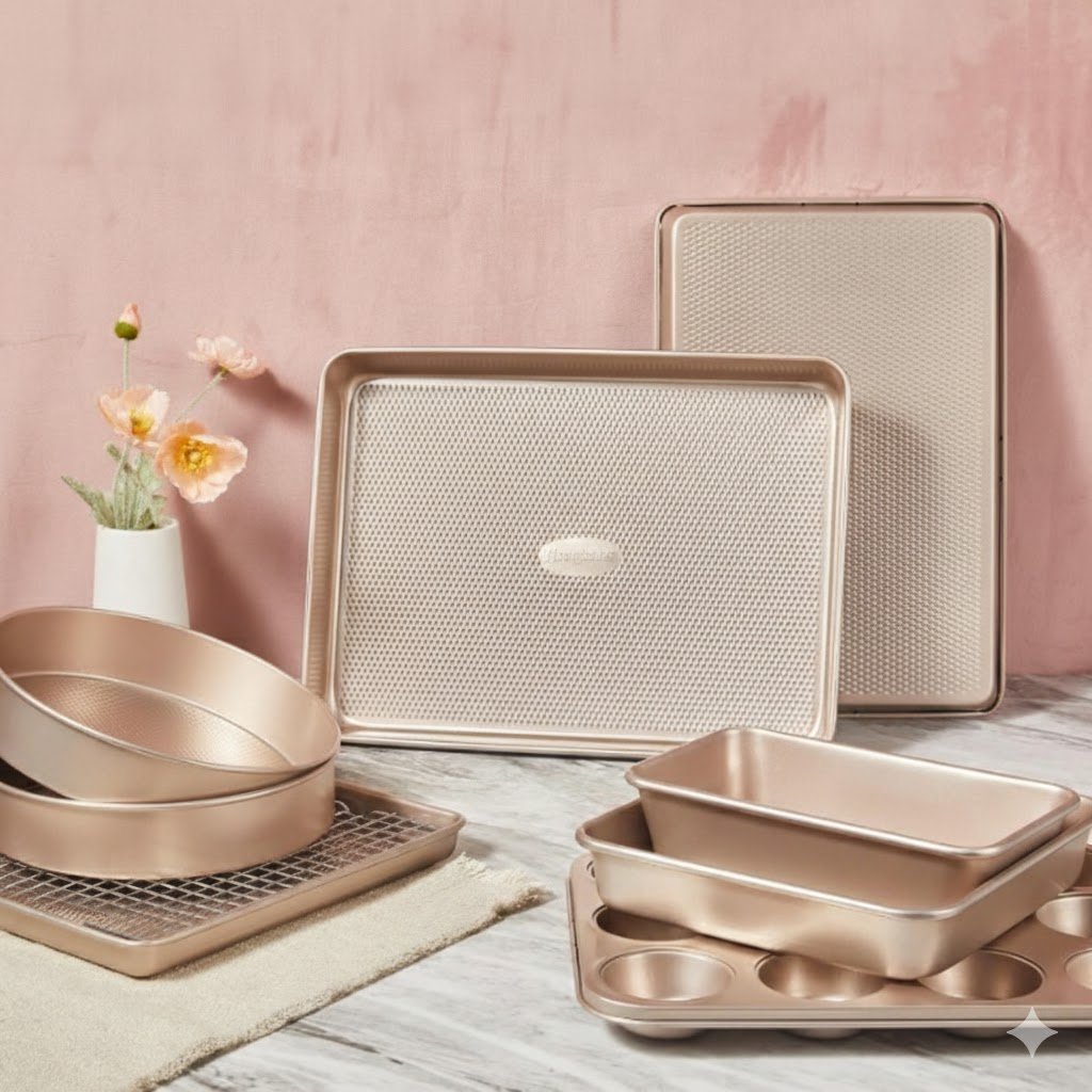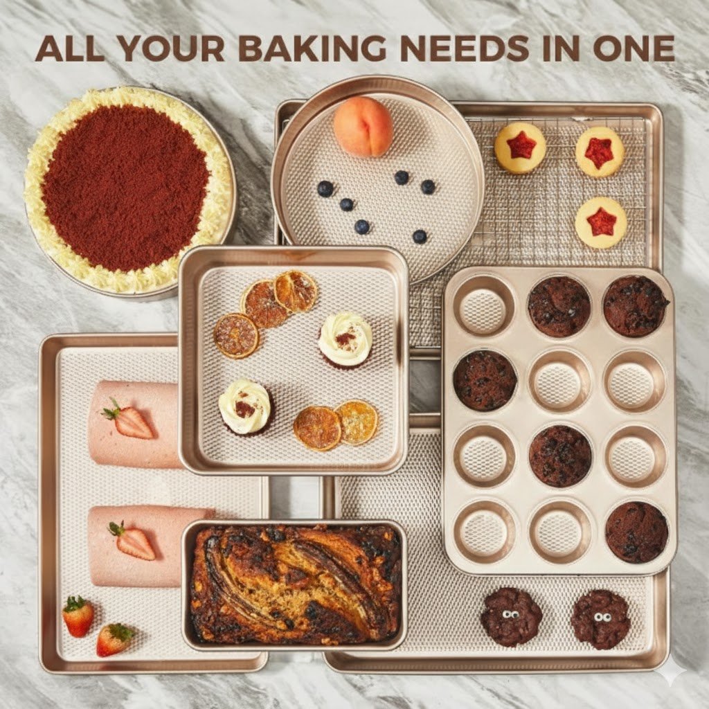 Versatile Set: Includes cookie sheet with rack, cake pans, roasting pan, muffin tin, and loaf pan