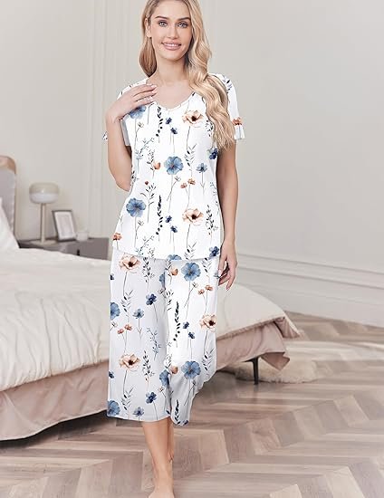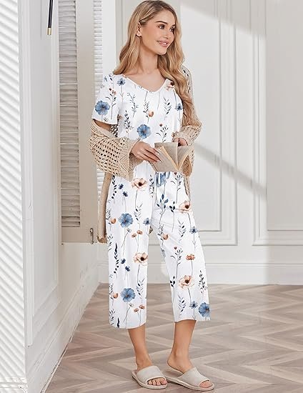 Two Piece Pajama Set: Includes a short sleeve pullover top and matching capri pants for relaxed and easy lounging.