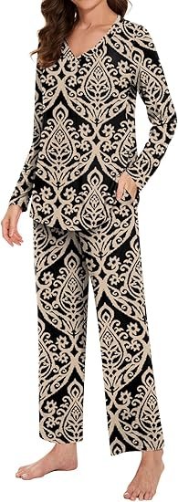 Women Long Sleeve Pajama Set V Neck Lounge Pants
