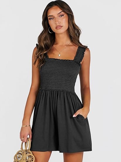 - Chic Summer Design: Square neckline with ruffled spaghetti straps, backless style, and built-in inner shorts