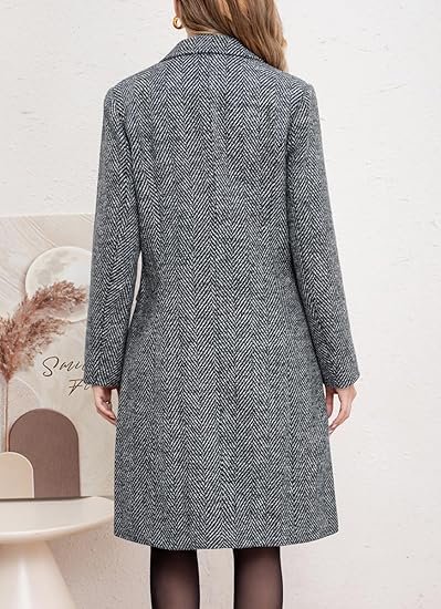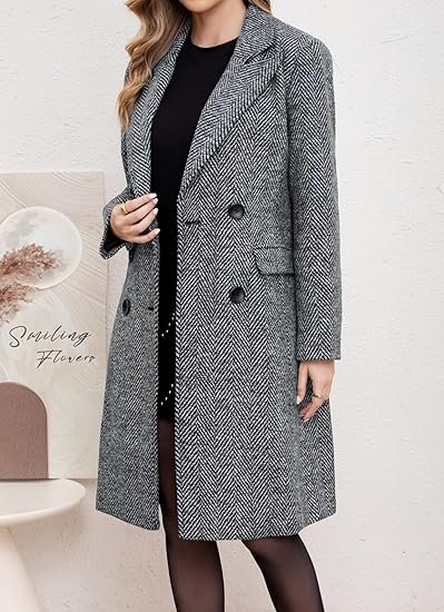 Midi Long Wool Coat: Features herringbone stripe pattern, double-breasted button placket, notch collar, long sleeves, and two flap pockets.